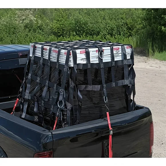 Tame loose loads with the FleetRun 4.75' x 6' Heavy Duty Cargo Net, built tough for trucks and trailers. With a 2,500 lb. break strength, 8" mesh openings, and included cam buckle ratchet straps, this net keeps your cargo locked down over every mile.